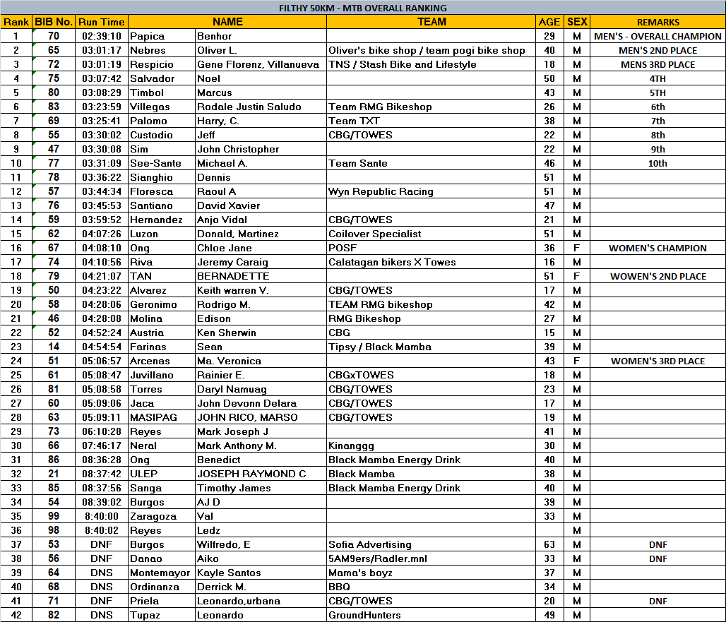 Congratulations to all finishers!!! Thank you to all sponsors, marshals and volunteers!!! Napaka FILTHY!!!!